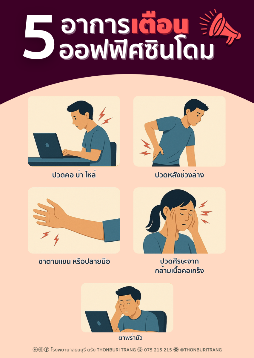 ออฟฟิศซินโดรมเป็นภาวะที่พบได้บ่อยในยุคทำงานหน้าคอม แต่สามารถป้องกันได้ไม่ยาก หากใส่ใจท่านั่ง ยืดเหยียด และดูแลกล้ามเนื้อเป็นประจำ หากมีอาการเรื้อรัง การประเมินโดยผู้เชี่ยวชาญด้านกายภาพบำบัด เช่น ทีมที่โรงพยาบาลธนบุรีตรัง จะช่วยดูแลอย่างถูกต้องและปลอดภัย
