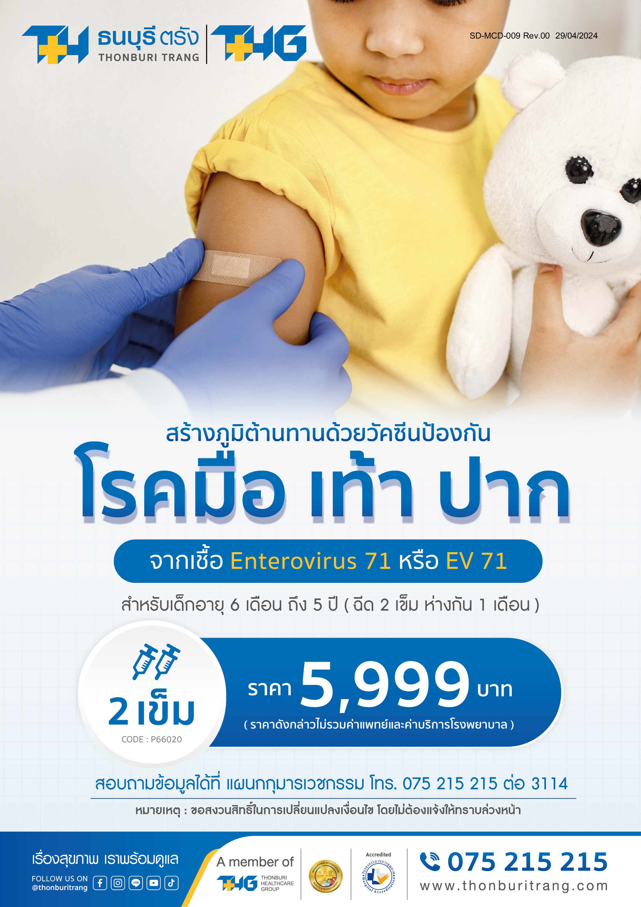 วัคซีนป้องกันโรคมือ เท้า ปาก (EV71) สำหรับเด็กอายุ 6 เดือน – 5 ปี ที่โรงพยาบาลธนบุรีตรัง ปลอดภัย ฉีด 2 เข็ม ห่างกัน 1 เดือน ราคาเพียง 5,999 บาท รวมค่าบริการ