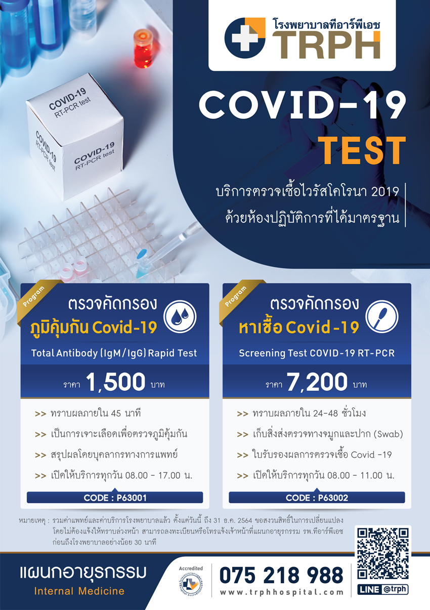 หมายเหตุ : ระยะเวลาตั้งแต่วันนี้ ถึง 31 ธันวาคม 2564 สามารถลงทะเบียนหรือโทรแจ้งเจ้าหน้าที่แผนกอายุรกรรม โทร.075-218988 ต่อ 3125 ก่อนถึงโรงพยาบาลอย่างน้อย 30 นาที